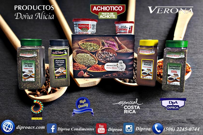 Canela en Astilla, Anís Dulce en Grano, Canela Molida, Clavo de olor entero, Clavo de olor Molida, Jamaica en Grano, Nuez Moscada Entera, Nuez Moscada Molida, Ajo Molido, Albahaca Entera, Albahaca Molida, Chile en Escama, Cebolla Molida, Culantro Molido, Culantro Entero, Cúrcuma Molida, Comino en Grano, Comino Molido, Comino y Pimienta en Polvo, Comino y Pimienta en Grano, Pimienta Blanca en Polvo, Pimienta Blanca en Grano, Pimienta Negra en Polvo, Pimienta Negra Entera, Laurel en Hoja, Laurel Molido, Mostaza en Grano, Mostaza Molida, Orégano en Hoja, Orégano Molido, Paprika Molida, Romero Entero, Romero Molido, Tomillo Entero, Tomillo Molido, Empanizador para Mariscos, Empanizador para Pollo, Empanizador Todo Propósito, Achiote en Polvo, Condimento Barbacoa, Condimento Mixto (Bomba), Consomé de Pollo, Consomé de Mariscos, Curry Molido, Marinador, Achiote en Pasta, Ajo en Pasta, Glutamato Monósodico, Sal de Apio, Sal de Ajo, Sal de Cebolla, Sazonador para Carnes, Sazonador Todo Tipo de Comidas, Sazonador Completo, Refresco en Polvo con Sabor a Crema, Refresco en Polvo con Sabor a Fresa, Refresco en Polvo de Cebada, Refresco en Polvo de Horchata, Refresco en Polvo de Pinolillo, Refresco en Polvo de Resbaladera, Bicarbonato de Sodio, Polvo para Hornear, Levadura en Grano, Gelatina en Lámina, Vainilla Líquida, Linaza, Chan, Cebada, Ajonjolí, Anís Dulce, Pimienta Negra, Pimienta Blanca, Nuez Moscada, Mostaza, Apio, Culantro, Achiote